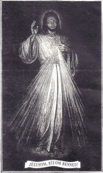 Este, amikor a cellámban voltam, megpillantottam az úr Jézust fehér ruhában. Egyik kezét áldásra emelte, a másikkal megérintette mellén a ruháját. Melléből a ruha nyílásán két hatalmas sugár tört elő, egy piros és égy halvány.... Kis idő múlva azt mondta Jézus: "Fess egy képet annak alapján, amit látsz, ezzel az aláírással: Jézusom, bízom Benned" .